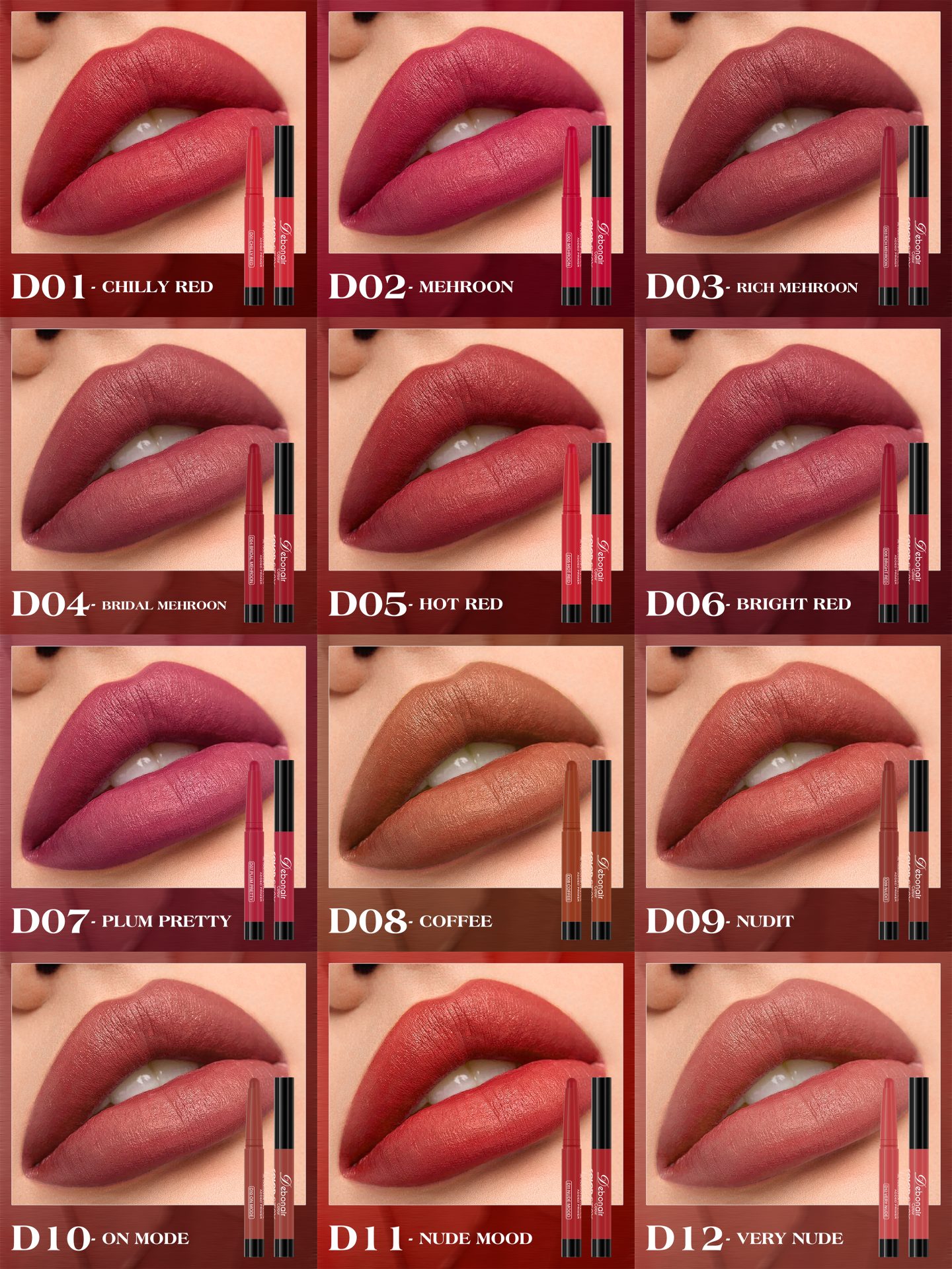BRIDAL MEHROON, BRIGHT RED, CHILLY RED, COFFEE, HOT RED, MEHROON, NUDE MOOD, NUDIT, ON MODE, PLUM PRETTY, RICH MEHROON, VERY NUDE