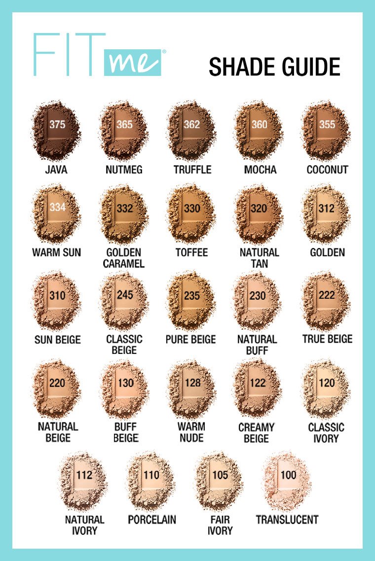 100-Translucent, 105-Fair Ivory, 110-Porcelain, 112-Natural Ivory, 120-Classic Ivory, 122-Creamy Beige, 128-Warm Nude, 130-Buff Beige, 220-Natural Beige, 222-True Beige, 230-Natural Buff, 235-Pure Beige, 245-Classic Beige, 310-Sun Beige, 312-Golden, 320-Natural Tan, 330-Toffee, 332-Golden Caramel, 334-Warm Sun, 355-Coconut