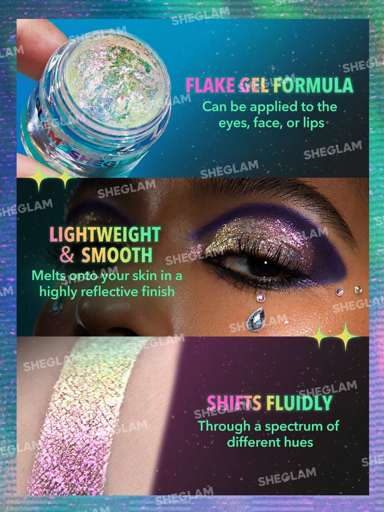 Shop the Sheglam Chroma Zone Multichrome Flake Gel in Cosmic Pearl at Frentica Cosmetics! ✨ Experience a dazzling, color-shifting effect with ultra-lightweight, high-pigment flakes for a mesmerizing, multidimensional look. Perfect for eyes, lips, and creative makeup looks. 100% authentic and long-lasting. Buy now in Bangladesh!